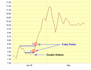 سنوضح كيفية اختيار نقاط الدخول الى السهم اعتماداً على نموذج القاع المزدوجة من خلال هذا الرسم البياني :