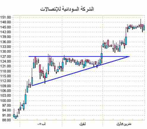 أما بالنسبة إلى المثلث المتصاعد فهو شكل فني على المتداول (أو المضارب )للأنتباه لوجوده لكي يشارك في الشراء والبيع فالمثلث المتصاعد (AscEnc,-Triansle)انه شكل فني له ضلعين يشكلان مثلث .(أما عن الضلع الأفقي فهو الأعلى وهو يشكل حاجز مقاومة فيقوم البائعون بالسيطرة عليه ولا يسمحون بأن يرتفع السعر أكثر من ذلك لأعتقادهم أنهم يستطيعون الشراء بسعر اقل أما بالنسبة إلى الضلع المائل فهو يشكل حاجز لدعم وهو يسيطر عليه المشترون و لا يسمحون بأنخفاض السعر لأن المشترون يعتقدون بأن الاسعار مجدية للشراء وأنه سيرتفع السعر أكثر من ذلك وعندما يقترب سعر التداول من أعلى المثلث تكون الحصة المواجهة أكبر وحاسمة بين المشترون والبائعون وتكون نقطة الأختراق التي الجميع ينتظرونها وهي Break out وهذه الحالة الأعلى فأن هذا الشكل الفني الأستمراري (Continoation Patern)في هذه للحالة يكون المشترون سيطروا على زمام الامور ويكون قد أرتفع السعر للأعلى وبذلك سيرتفع المثلث الموجود حسابياً و مثالاً حي تم تطبيق هذه النظرية على الشركة السودانيه للاتصالات